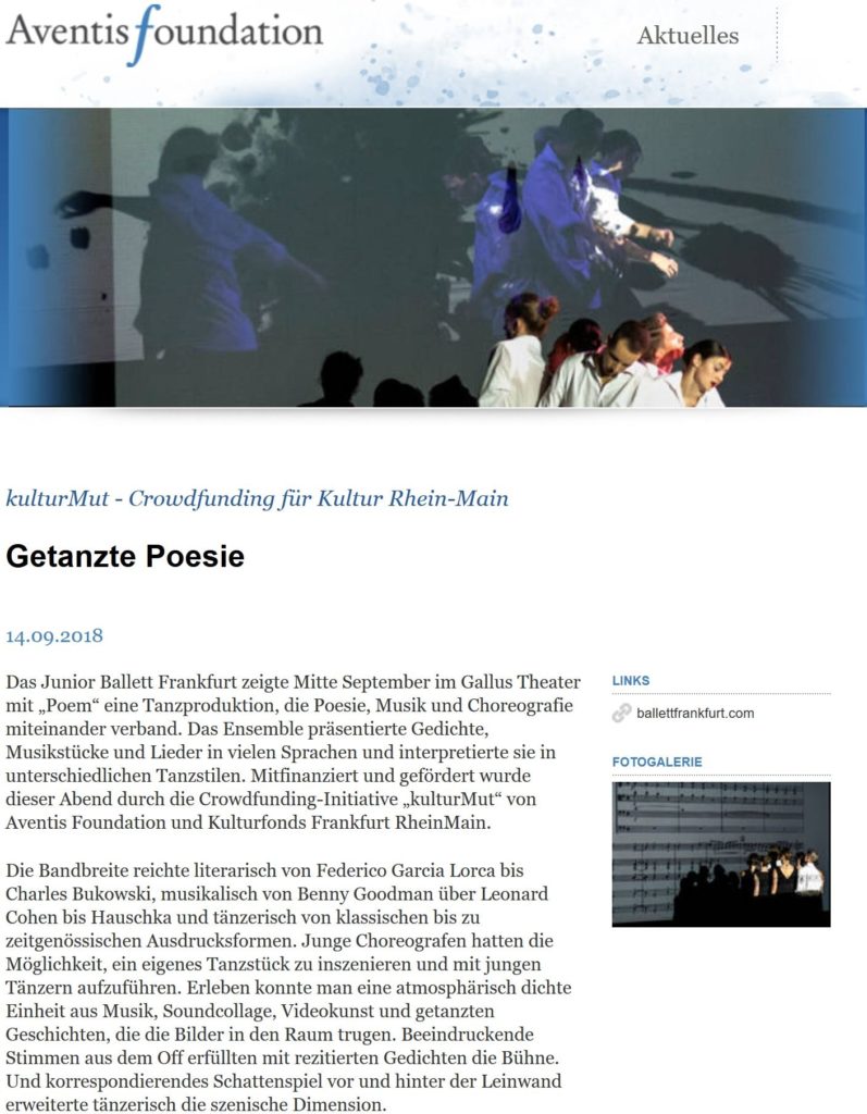 Aventis Foundation über „Poem“ Premiere im Gallus Theater: „Getanzte Poesie“. Weiterlesen…